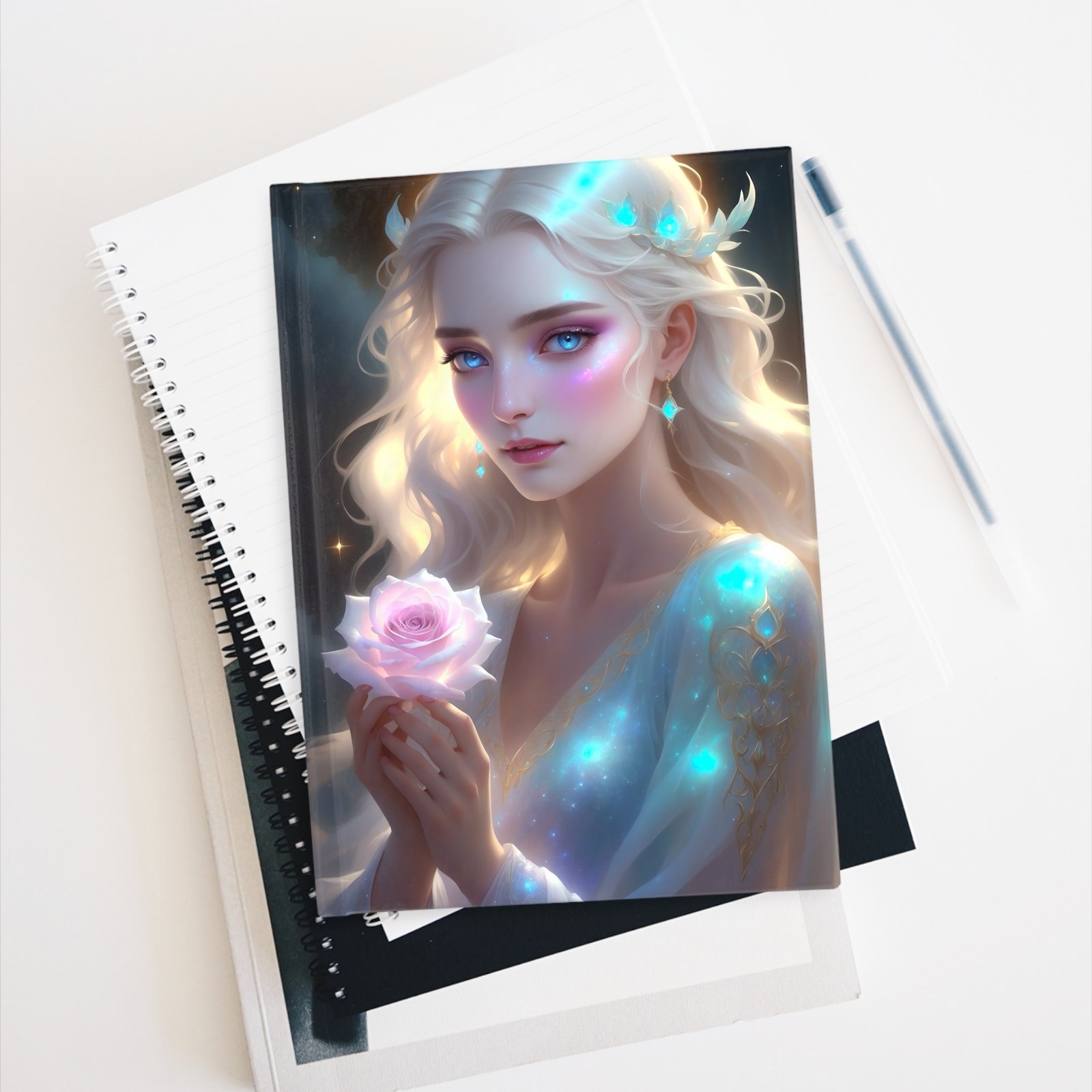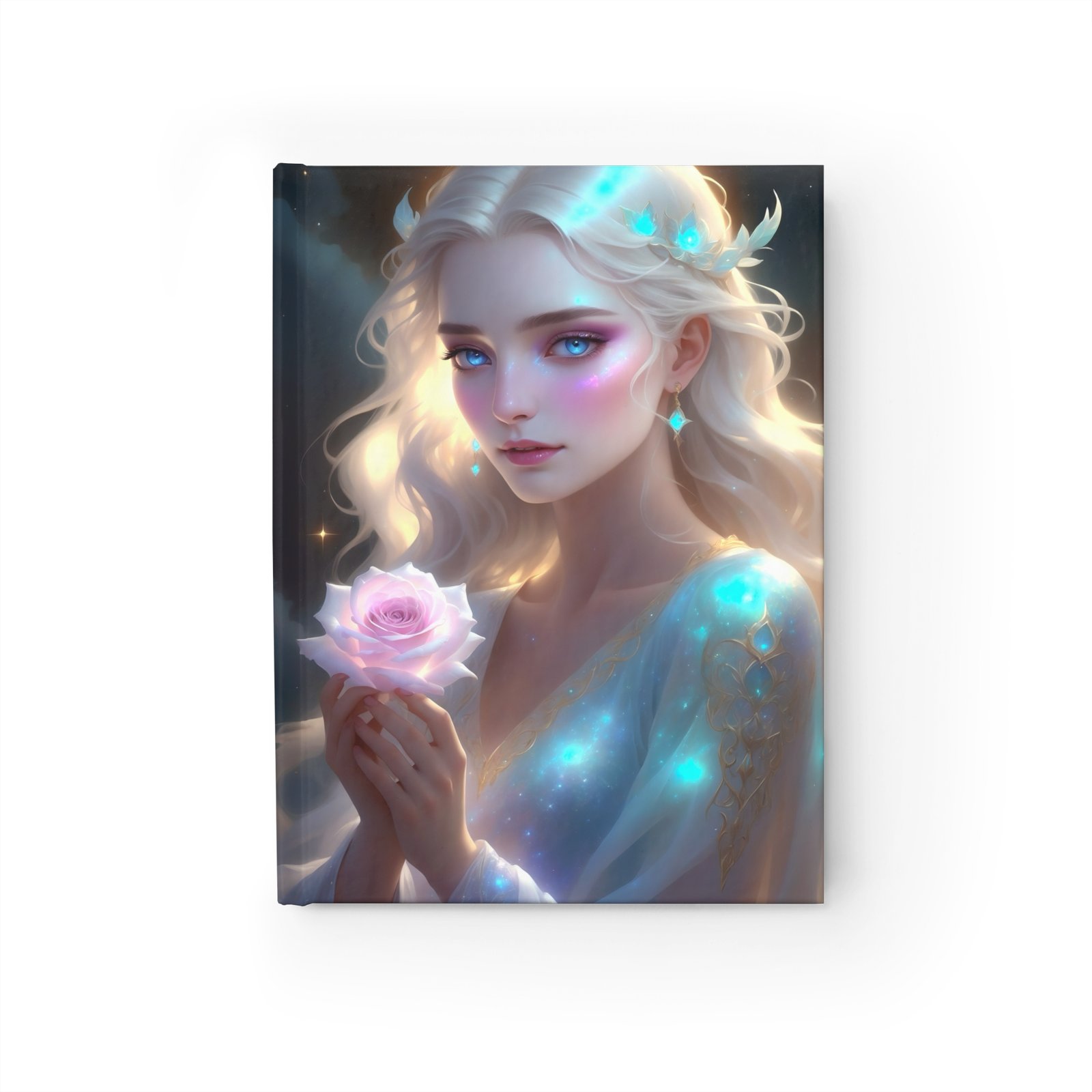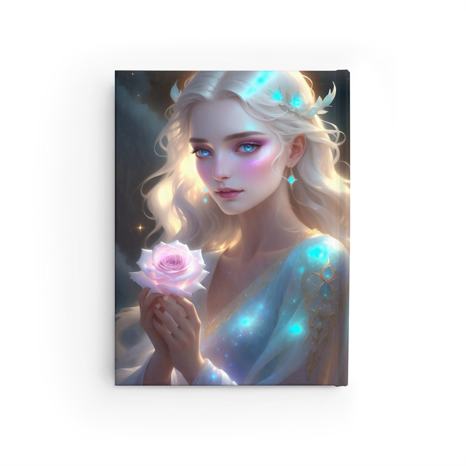 Embark on a journey of mystical exploration with the “Celestial Rose” journal, featuring the revered High Priestess of the Rose. This stunning journal showcases a luminous lady, radiating with ethereal stardust and spiritual grace. As the High Priestess, she holds a rose—a symbol of sacred wisdom, deep intuition, divine love and femininity.